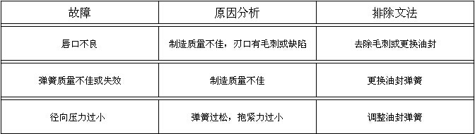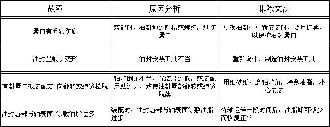 骨架油封屬于動密封元件,“臨界油膜”的存在,是油封密封的必要條件,無泄漏的密封是不允許的,也是不可能的。因為潤滑油膜的存在是保證油封刃口實現潤滑摩擦鎖必不可缺的,而潤滑油膜的存在,使得一定量的泄漏不可避免。對旋轉用油封,在使用過程中,如果在運行初期的50~100小時之內發(fā)生微量的泄漏是允許的。隨著運轉時間的加長,泄漏會逐漸停止,往往這樣的油封壽命比較長。在有效使用期限內,微量的泄漏是允許的,否則,必須按照下述油封的常見故障原因及排除方法進行處理。