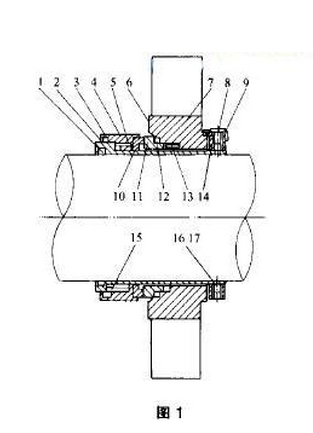 集裝式機(jī)械密封件一般都是平衡型機(jī)封,圖l所示的集裝式機(jī)封,其結(jié)構(gòu)特點(diǎn)是全部零件組合為一個(gè)整體的密封件,彈簧不與密封端面接觸,平衡型、內(nèi)流、定位塊可以調(diào)節(jié)彈簧壓縮量。考慮到當(dāng)動、靜密封環(huán)磨損時(shí)可以更容易補(bǔ)償,設(shè)計(jì)有動環(huán)密封圈。