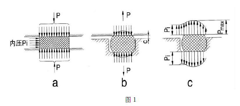 我們把O型密封圈與平墊圈作一比較。圖1 a 是平墊片工作時(shí)的接觸壓力分布,分布是均勻的,如介質(zhì)壓力Pi 大于接觸壓力,則泄漏有可能發(fā)生。而O型密封圈的初始接觸壓力是不均勻的(圖1 b),工作時(shí)在內(nèi)壓力作用下O型密封圈沿作用力方向移動(dòng),并改變其截面形狀,密封面上的接觸壓力也相應(yīng)變化(圖1 c),其大值Pmax 將大于介質(zhì)內(nèi)壓,所以不發(fā)生泄漏,這是O型密封圈用作靜密封的密封機(jī)理,這種借介質(zhì)本身壓力來改變O型密封圈狀態(tài)使之實(shí)現(xiàn)密封的過程,我們稱之為“自密封作用”,實(shí)踐證明,這種自密封作用對(duì)防止泄漏是的。為了實(shí)現(xiàn)自密封作用,在安裝O型密封圈時(shí)應(yīng)使它有一定的壓縮變形量。當(dāng)溝槽壁的粗糙度較低時(shí),此變形量即使很?。ㄔ?.1mm左右)也能起到自密封的作用,但是,如果溝槽壁的粗糙度較高而內(nèi)壓很小時(shí),就很難產(chǎn)生自封作用,此時(shí)需要增大壓縮變形量。在溫度變化的情況下,需要把溫度影響的附加變形量考慮進(jìn)去。  自封的作用是有限的,當(dāng)內(nèi)壓過高時(shí),會(huì)出現(xiàn)O型密封圈的“膠料擠出”現(xiàn)象。即密封部位因有間隙存在,受高壓作用的O形密封圈會(huì)在間隙處產(chǎn)生應(yīng)力集中。當(dāng)其壓力大到O型密封圈的膠料不能承受時(shí),膠料就會(huì)被擠了出來(圖2),形成一道飛邊嵌入間隙之中,此時(shí)雖然O型密封圈還能暫時(shí)維持密封,但實(shí)際上已經(jīng)損壞。